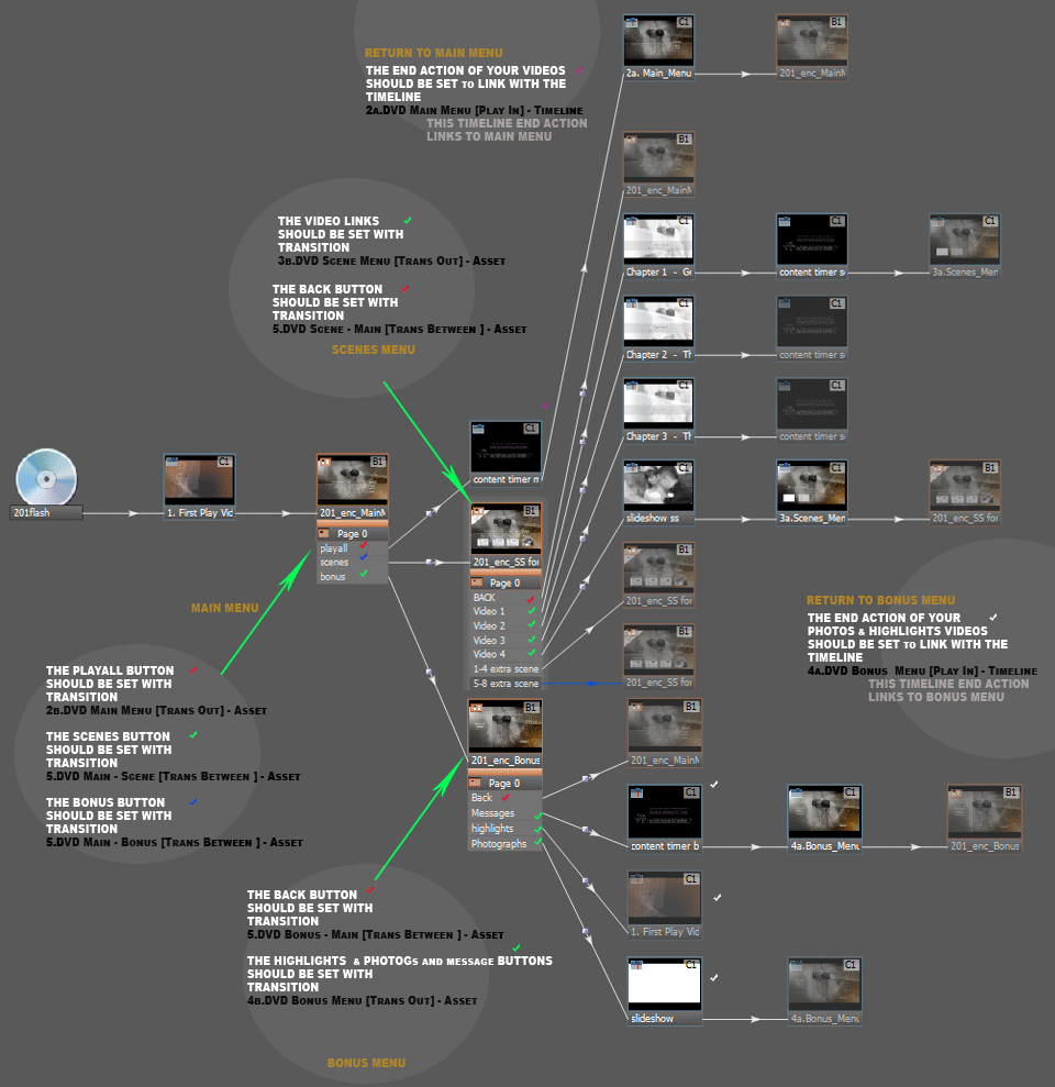 Import your video and link the menus/videos as per the guide below setting the respective transitions as described