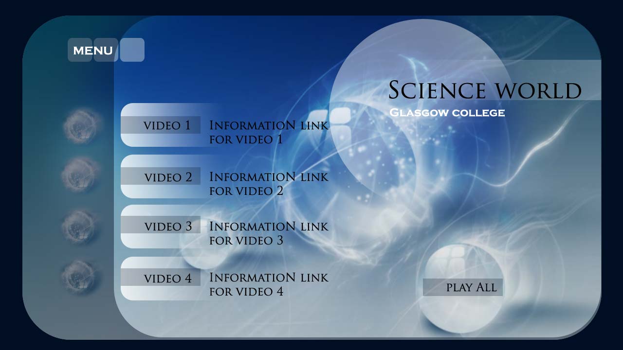 * Menus above are supplied in psd /Encore format with prebuilt motion backgrds for non A/F/x users